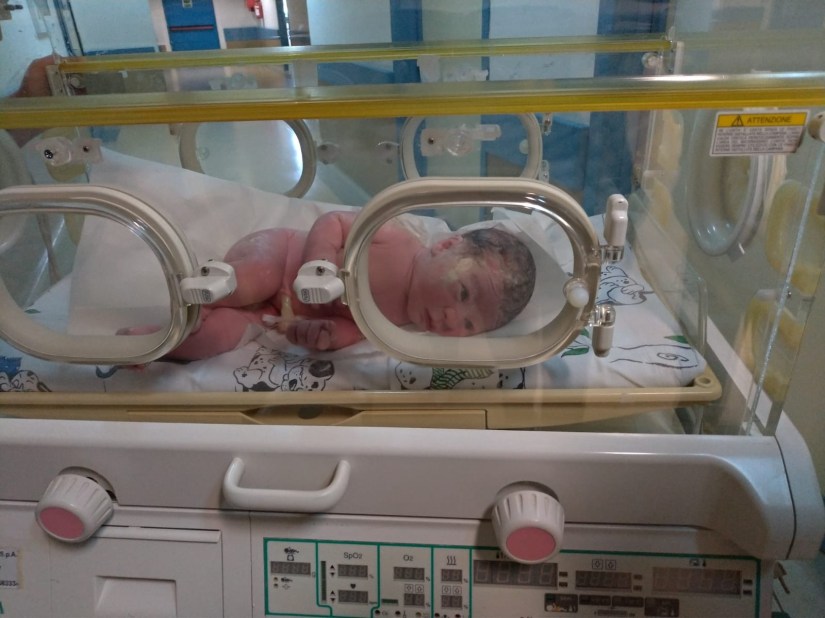 Entrata in sala travaglio scopro che è di turno l’ostretrica con cui avevo partorito Salvatore la prima volta due anni fa, quasi saltello dalla gioia per la notizia, avevo già così tanti ricordi legati a quella persona in più sapevo quanto fosse brava e quanta tranquillità mi avesse trasmesso quella volta. La Signora Mirella mi visita e insieme al medico decidono di fare l’epidurale. Intorno alle 12:30 capisco che è arrivato davvero il momento, mi portano in sala parto e, con non poche spinte, nasce il nostro piccolo Topolin che poi tanto piccolo non era con i suoi 3,720 kg.