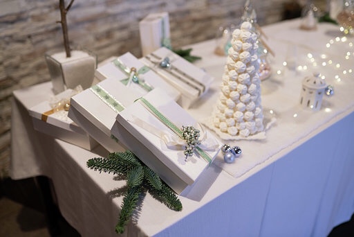 Per l’allestimento ho deciso di fare tutto da sola, con l’aiuto di mia mamma, abbiamo preparato i centrotavola con dei tronchi su cui abbiamo poggiamo dei piccoli alberelli di Natale con palline e luci mentre come segnaposto abbiamo creato una piccola ghirlanda con un fiocchetto.