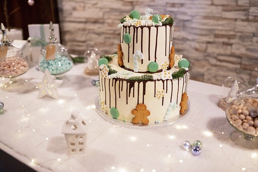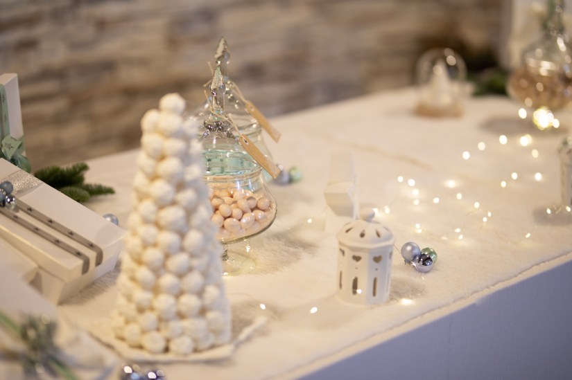 Per il tavolo della torta e in generale per la festa non ho scelto un vero e proprio tema, ho sfruttato l’effetto degli addobbi natalizi accostandoli però a colori tenui come quelli pastello insieme all’oro e l’argento. Intorno alla torta c’erano 4 ampolle in vetro con dei confetti di 4 colori diversi beige, rosa celeste e verde, alberi di meringhe bianche, palline e lucine su tutto il tavolo.