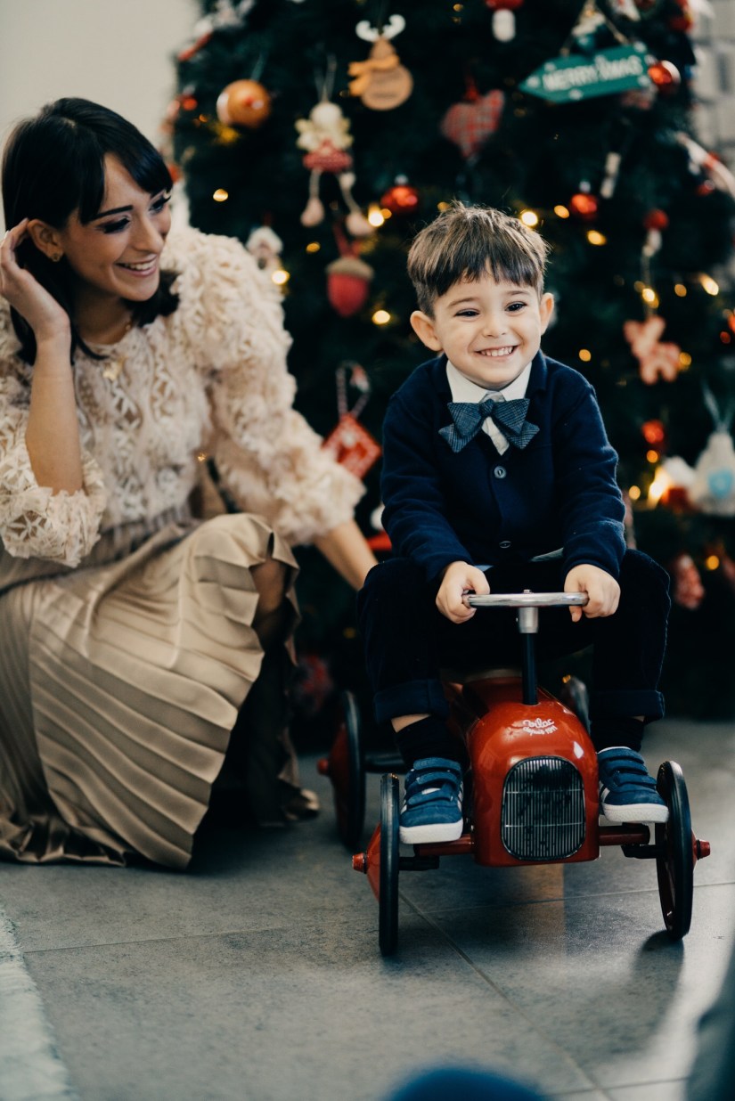 Per il tavolo della torta e le bomboniere ho scelto il brand Henriette. Lanterne, stelle e campane di vetro luminose erano posizionate intorno alla torta. Piattini a forma di fiocco di neve e tante palline. Per la bomboniera è stato amore a prima vista, non ho avuto dubbi nella scelta: un alberello come simbolo di questo periodo magico con un cavalluccio a dondolo per ricordare il piccolo Francesco agli invitati.